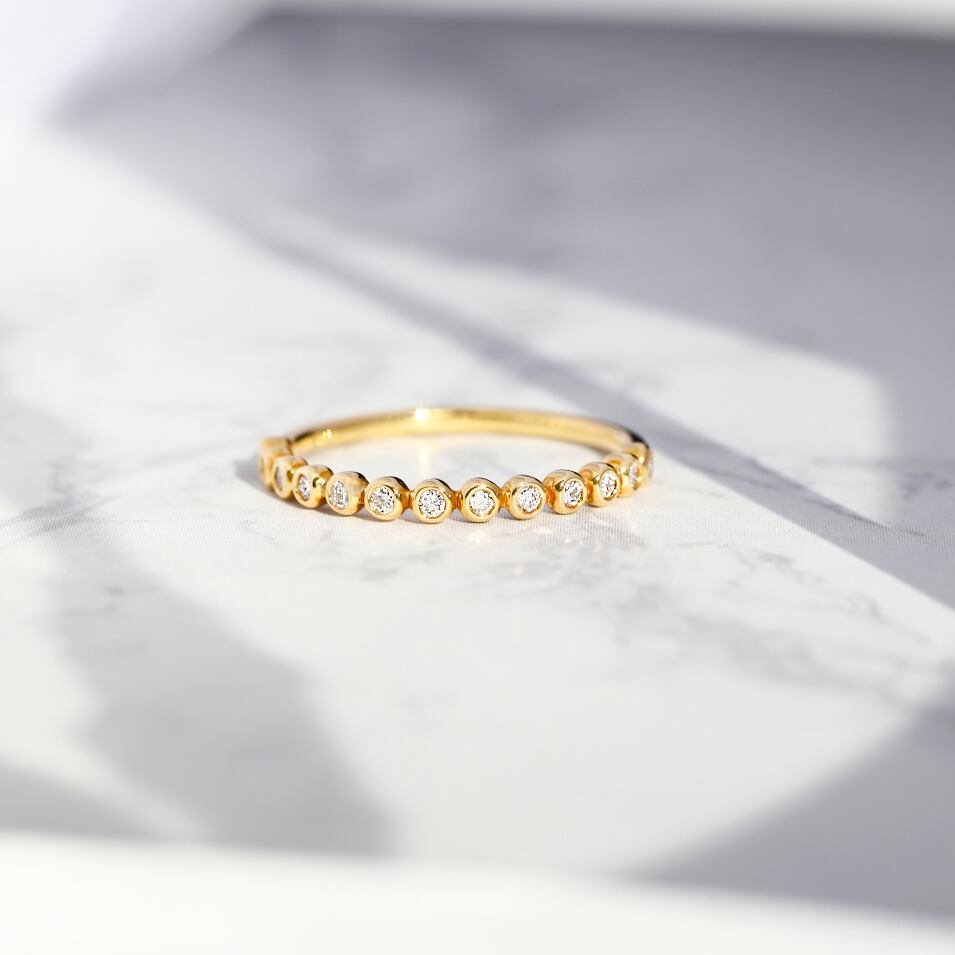 ダイヤモンドの淵を丸く囲んだデザイン。プラチナが丸いラインを描く、愛嬌のあるフォルムです。滑らかやつけ心地と強度のある構造で、日常使いにも安心のエタニティリングです。