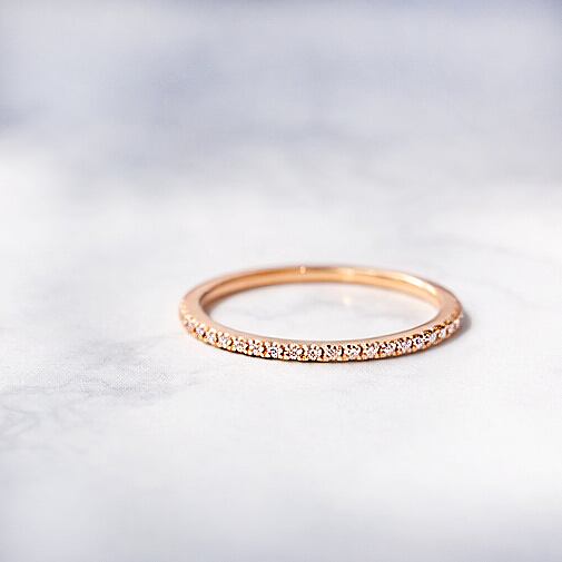 小さなダイヤモンドを並べた繊細なエタニティリング。そっと寄り添う優しい光は、かすみ草のような繊細な華やかさです。デイリーに重ね付けしやすいデザインで贈り物にもおすすめです。